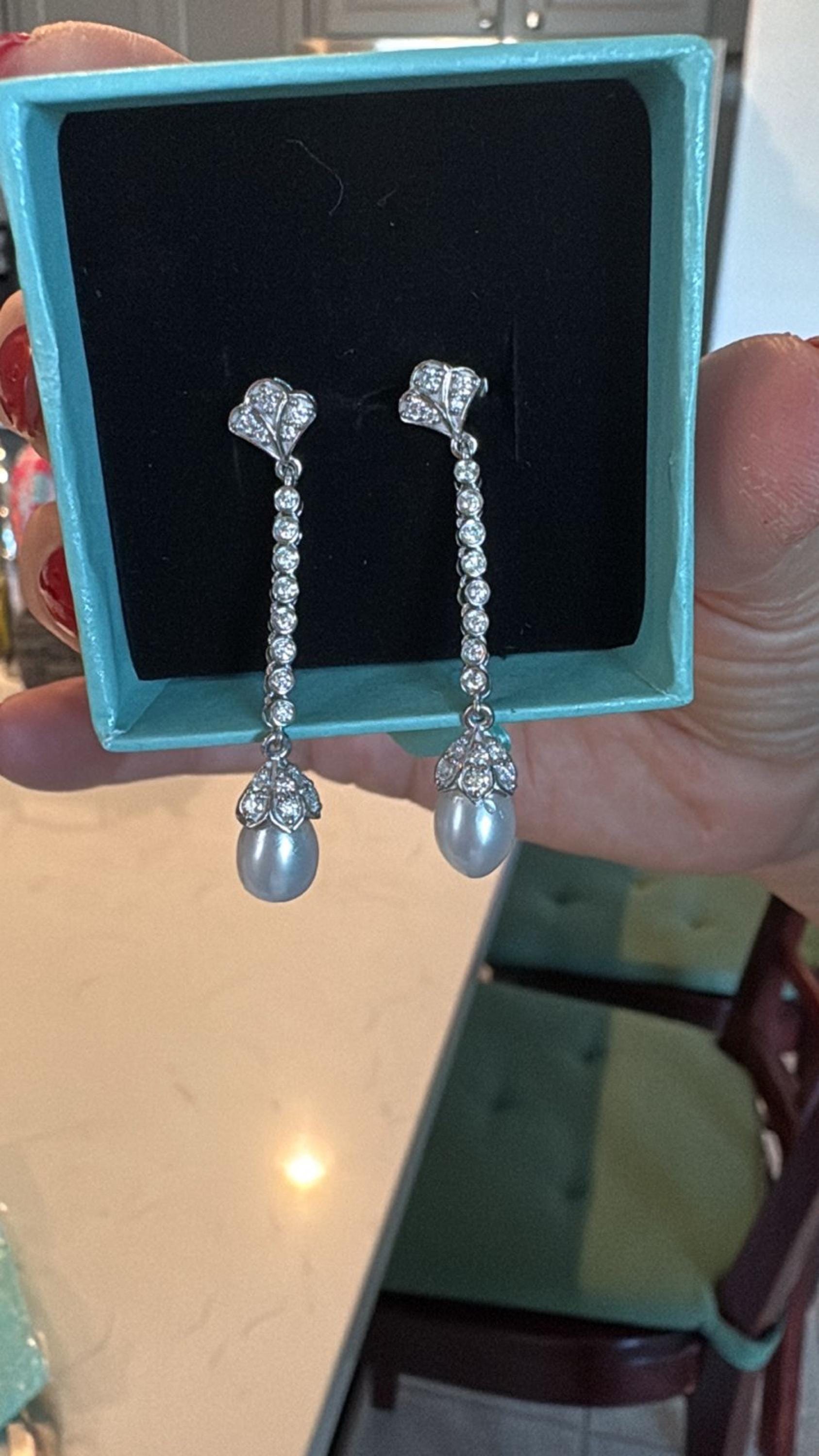 White Cultured Freshwater Pearl Statement Drop Earrings | Dangling Diamond Earrings | Anniversary Gift Bridal Silver Pearl Diamond Earrings