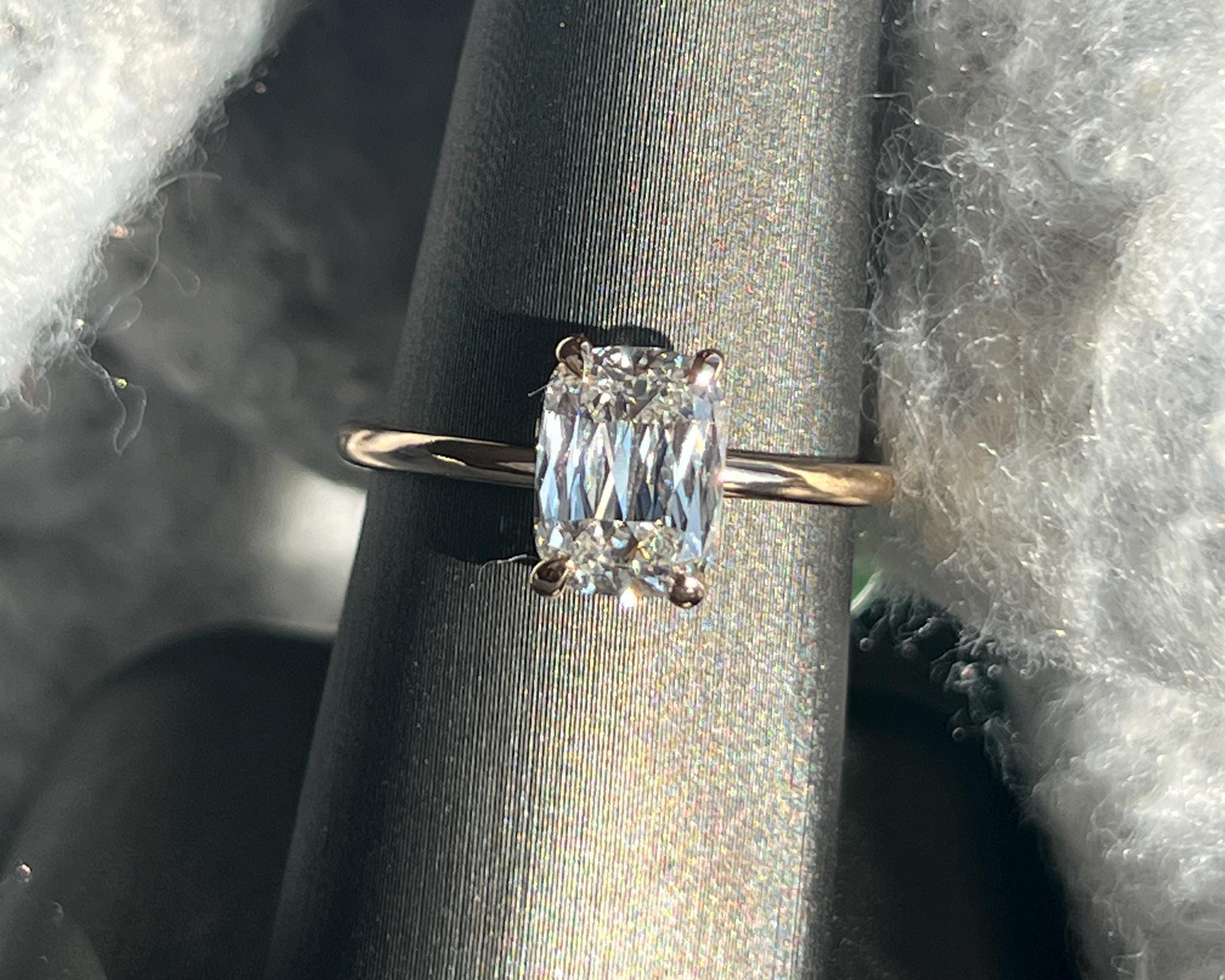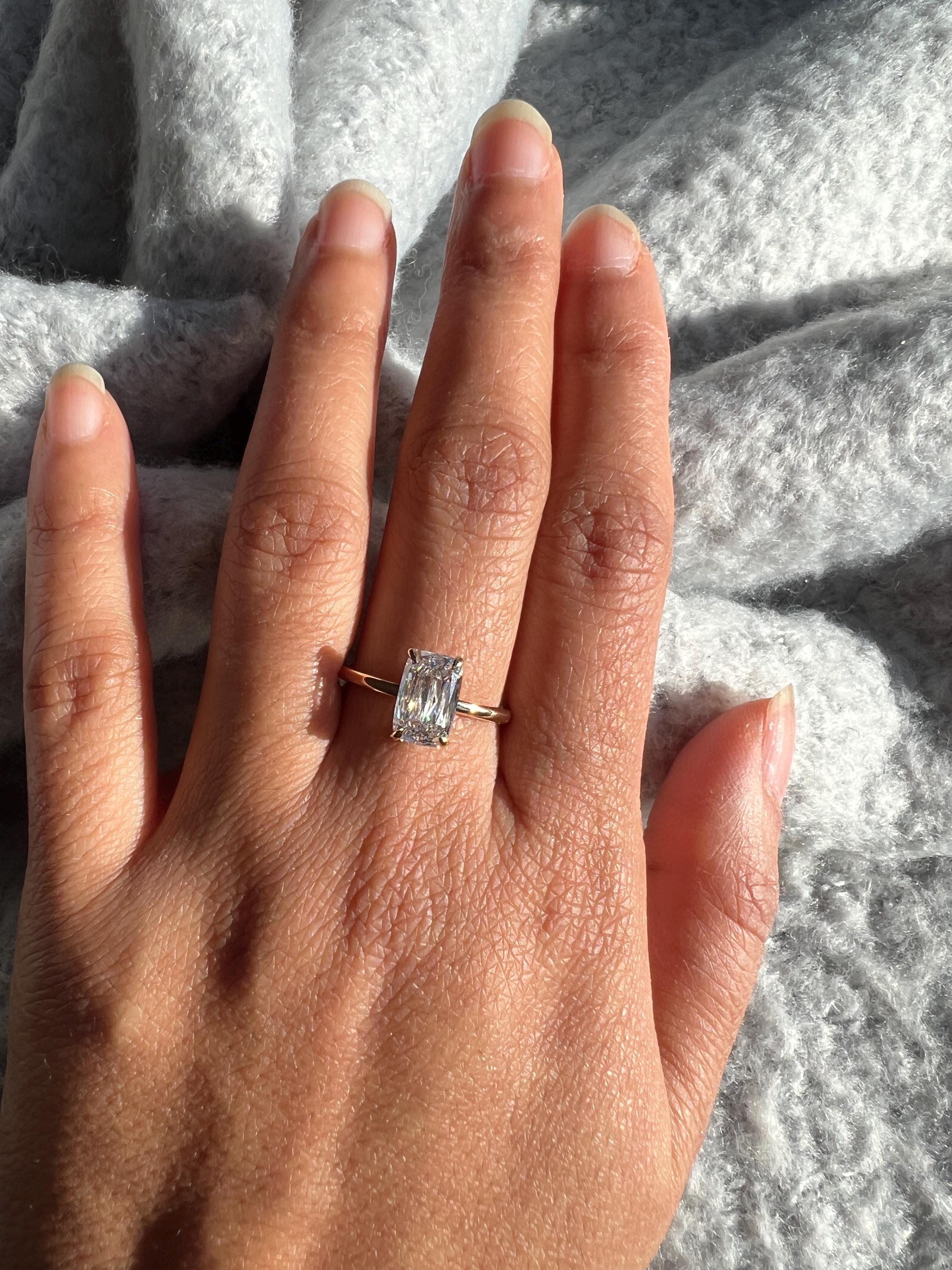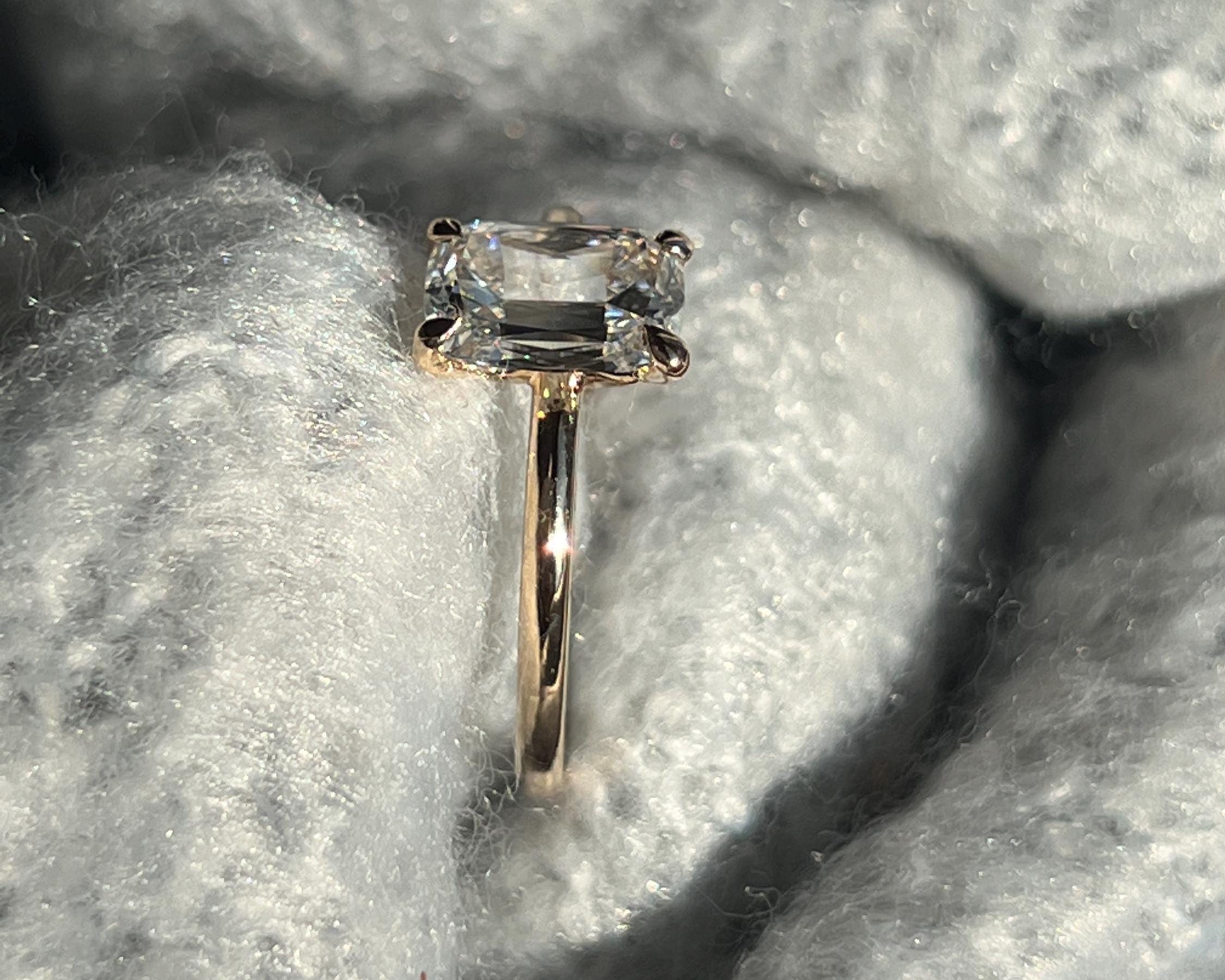 This elegant emerald-cut moissanite ring is designed for lovers of clean lines and timeless beauty. Set in solid 14K gold, the rectangular solitaire stone offers a refined sparkle that feels both modern and classic- perfect as an engagement ring, promise ring, or everyday fine jewelry.